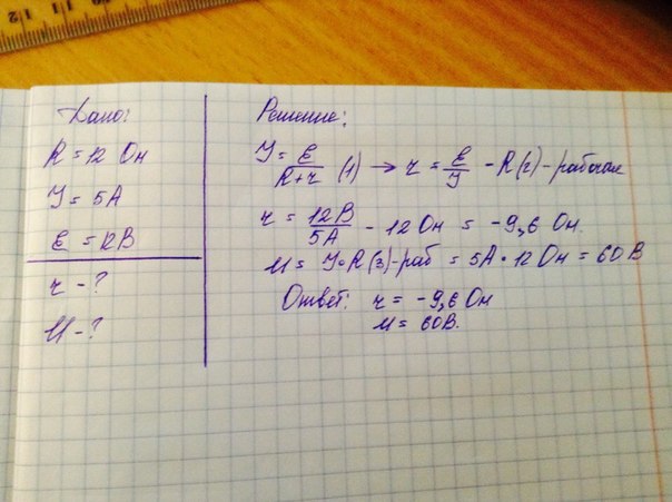 R=12Омы I=5A E=12В. Найти r-? U-?решите задачу по физике пожалуйста)))))
