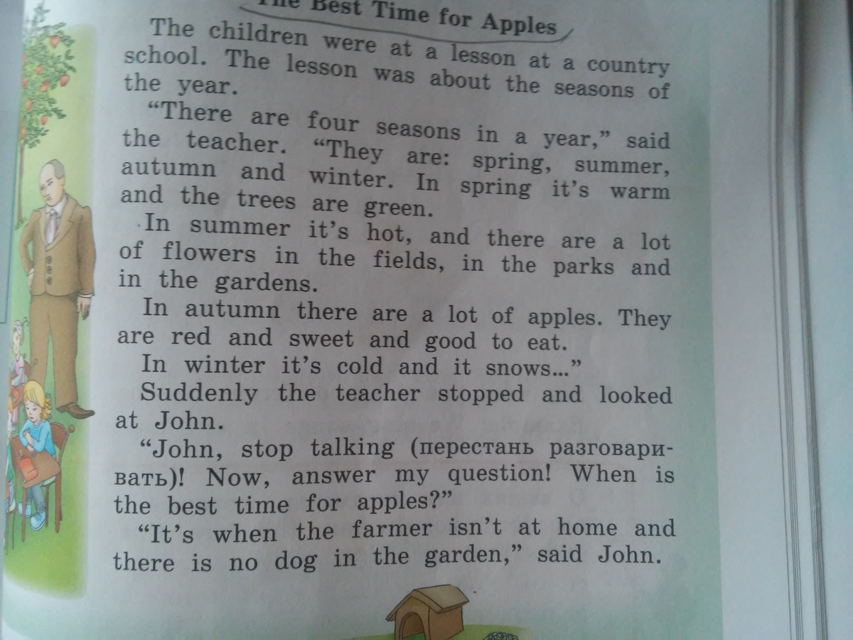 Вдруг учительница остановилась и посмотрела на Джона. Джон, перестань разговаривать! Ответь на мой вопрос сейчас! Какое лучшее время для яблок?