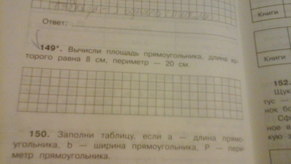 Периметр прямоугольника Р=(а+Ь)*2 Р=20 см...а (длина)=8 см...Ь (ширина)=? см Ь=Р:2-а=20:2-8=10-8=2 см ширина прямоугольника Площадь прямоугольника S=а*Ь=8*2=16 см²