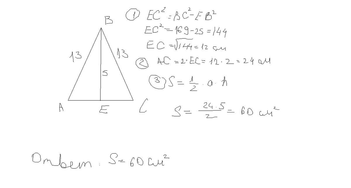 В равнобедренном треугольнике боковая сторона равна 13 см, а высота проведенная к основанию 5 см.Найди площадь треугольника.