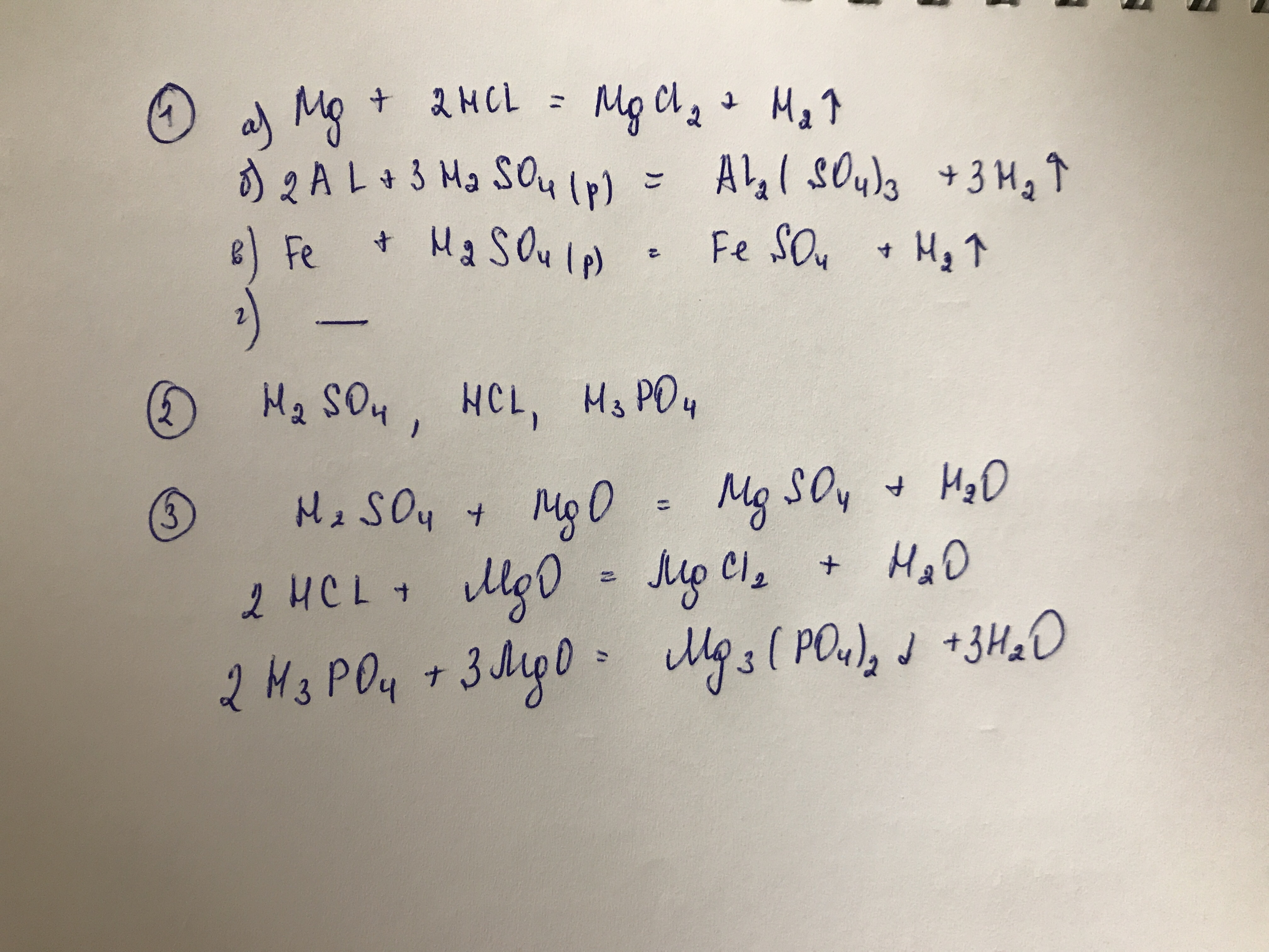 1) Используя ряд активности металлов,закончите уравнения тех реакций, которые осуществимы: а) Mg + HCl (разб.) = б) Al + H2SO4 (разб.) = в) Fe + H2SO4 (разб.) = г) Cu + HCl = 2) Из приведенных ниже веществ выпишите формулы кислот: H2O, KCl, H2SO4, HCl, Ba (OH)2, H3PO4, NaCl. Составьте уравнения реакций этих кислот с оксидом магния.