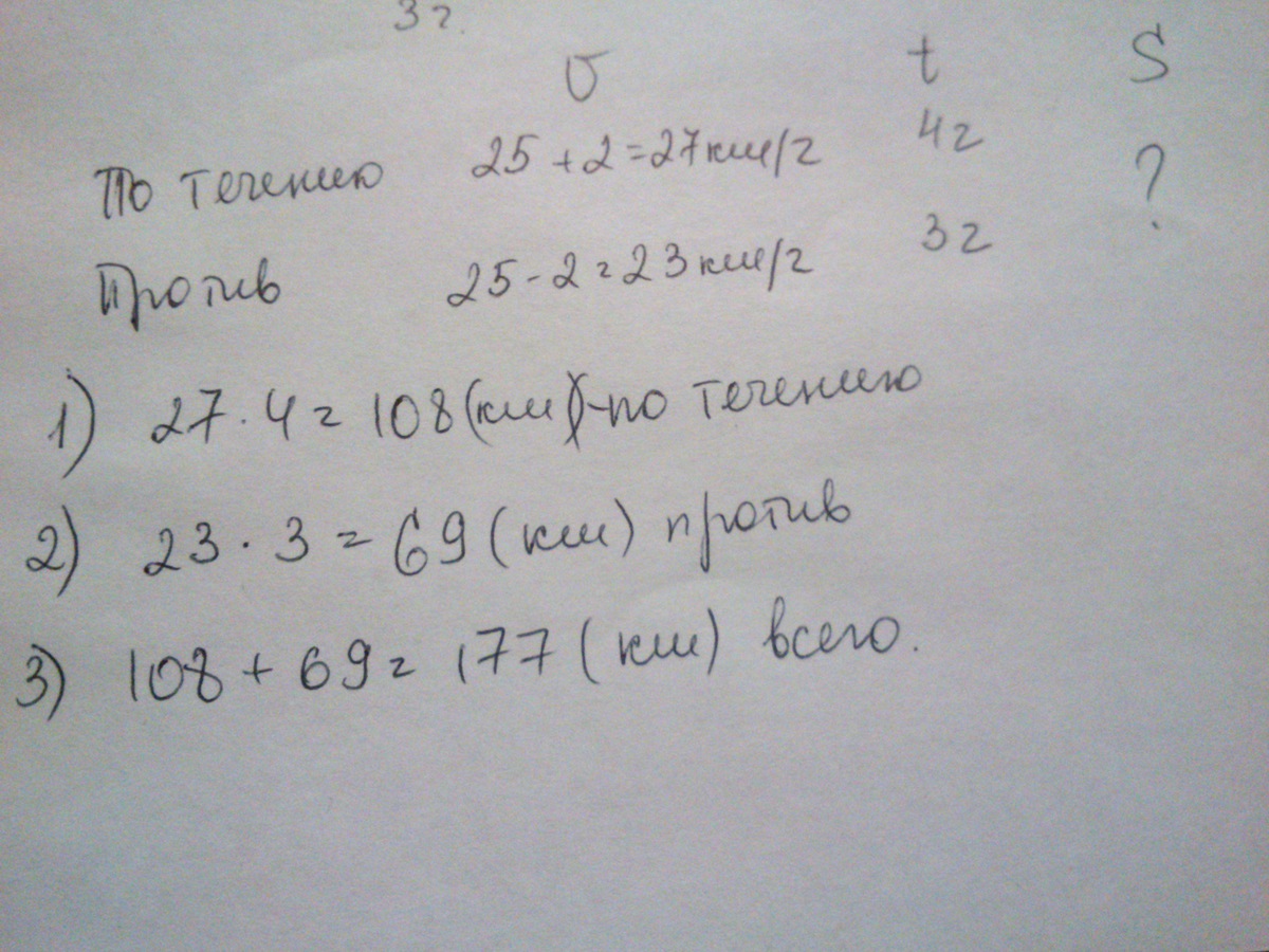 (25+2)*4+(25-2)*3=108+69=177 км проплыла лодка