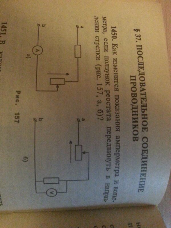 Как изменятся показания амперметра и вольтметра, если ползунок реостата передвинуть в направлении стрелки?