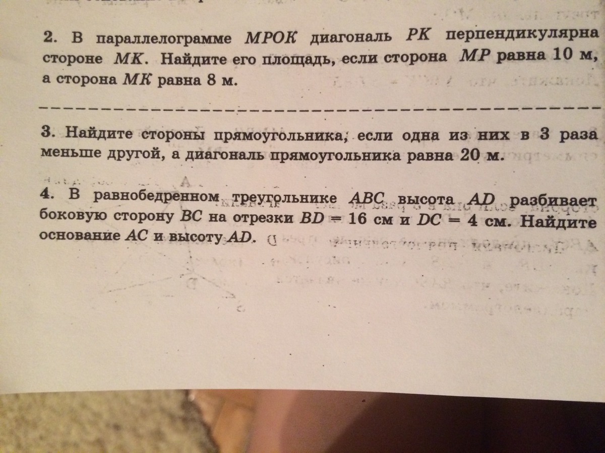 2) Если диагональ РК перпендикулярна основанию МК, то она является высотой параллелограмма.
