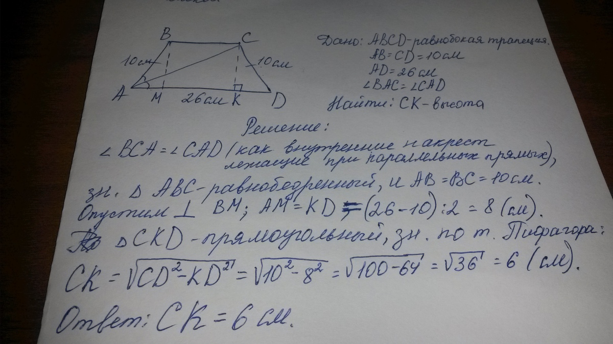 Большее основание AD трапеции ABCD равно 26см, АВ =CD =10см, диагональ АС делит угол А пополам. помогите найти высоту трапеции???