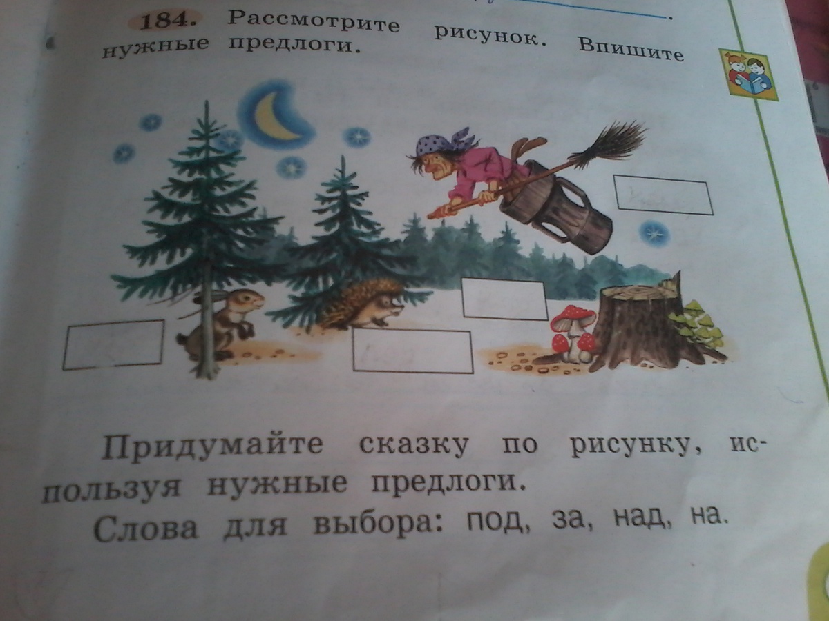 Рассмотрите рисунок. Впишите нужные предлоги. Придумайте сказку по рисунку, используя нужные предлоги. слова для выбора под, за, над, на