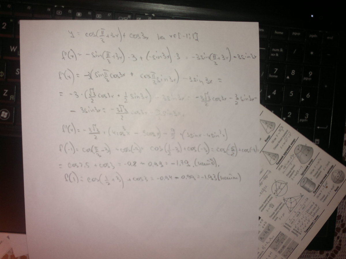 y=-sin(pi/3+3x)*3-sin3x*3=-3sin(pi/3+3x)-3sin3x.Дальше прировняй к нулю и реши уравнение.Получившиеся корни подставь в уранение,которое в условии и получишь наименьшее и наибольшее значения