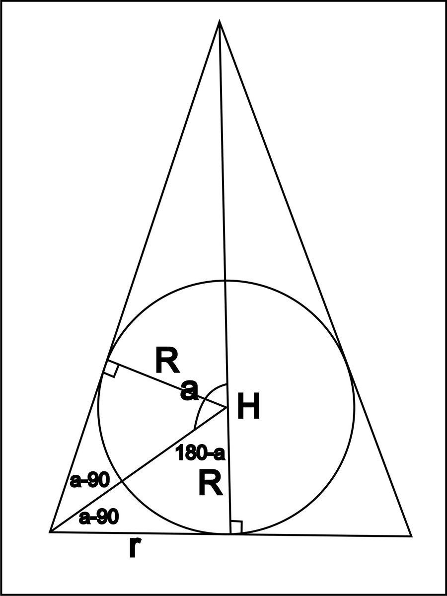 V=(1/3)*пr^2*H=-(1/3)п*tg^3(a)*R^3*tg(2a)