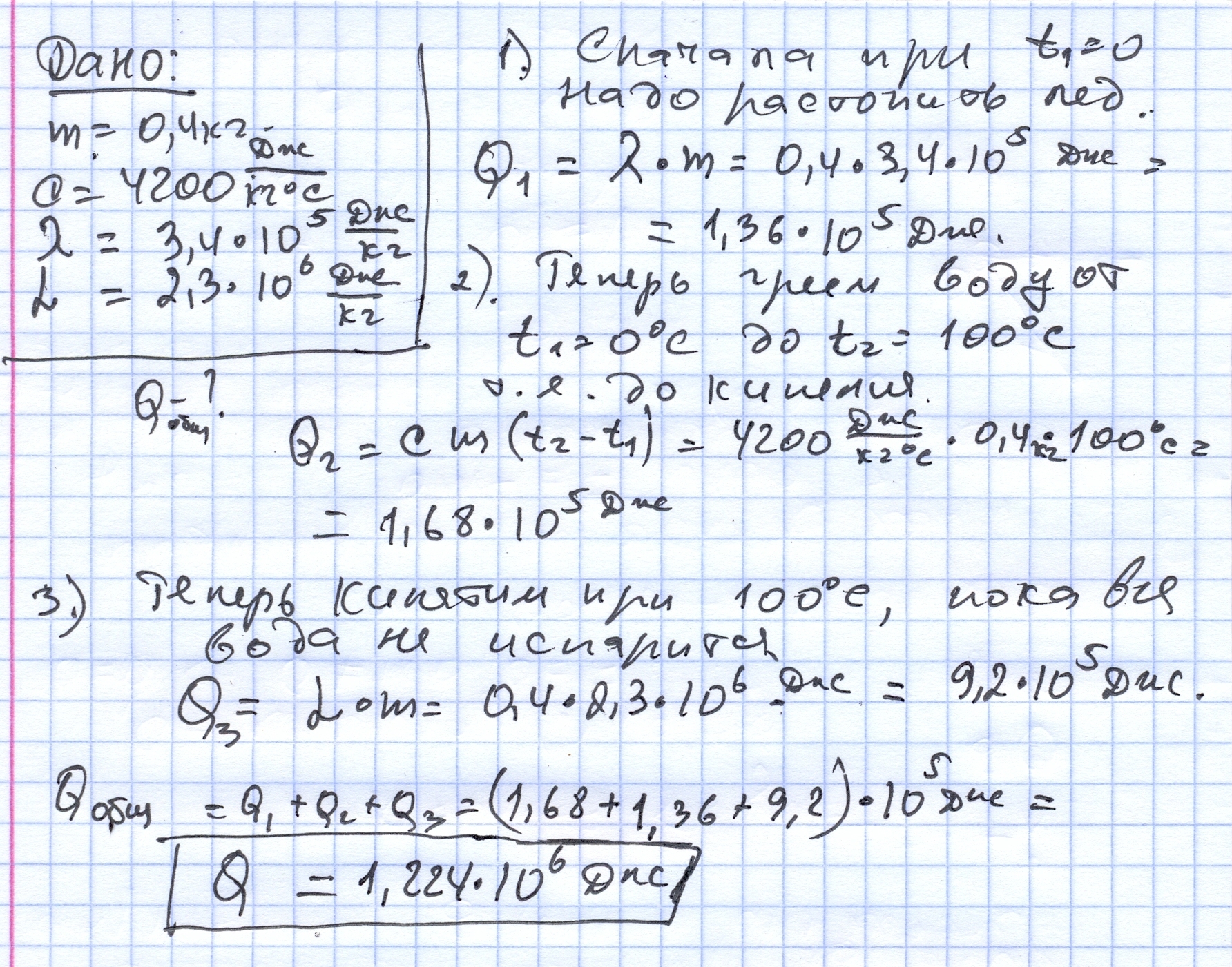 Какое количество теплоты потребуется,чтобы лед массой 400г при тепмературе 0*С превратить в пар при температуре 100*С?(удельная теплота плавления льда 3,4*10^5 Дж/кг,удельная теплоемкость воды 4200 Дж(кг*С),удельная теплота парообразования воды 2,3 *10 ^6 Дж/кг. )