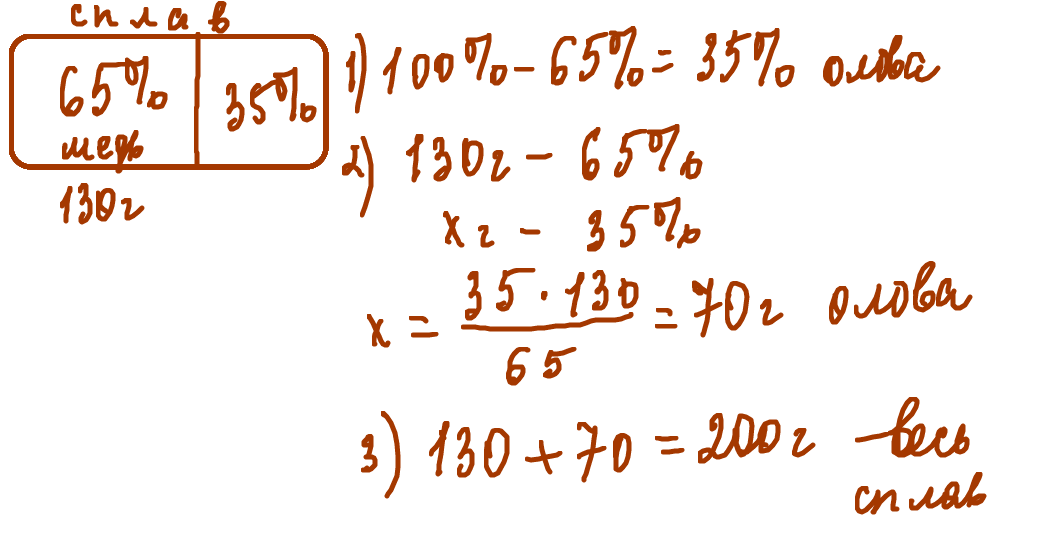 сплав меди и олова содержит 65% меди. Какова масса всего сплава и масса олова в нём, если меди в этом сплаве 130 г. ?