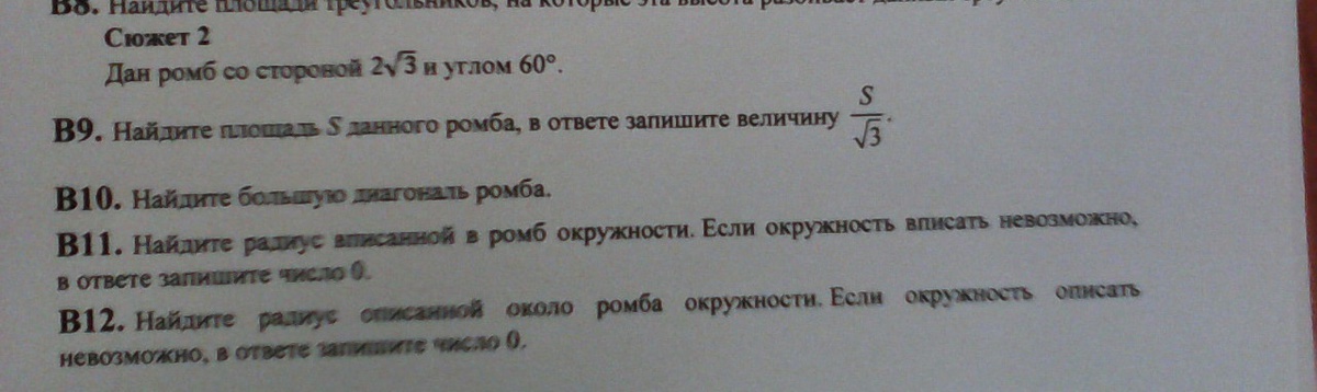 B9)S=1/2*a²sinα(а - сторона, α - угол ромба)