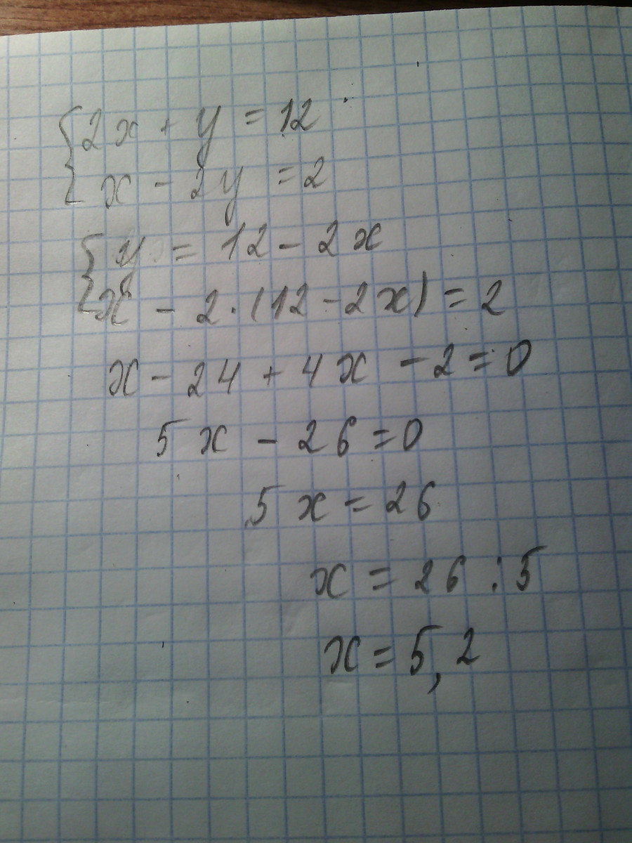x-2y=2 x-2(12-2x)=2 x-24+4x=2 5x=26 x=26/5 x=5 1/5 x=5 1/5