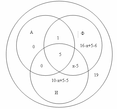 Нам известно, что во всех трех странах было 5 сотрудников. В Англии и Италии тоже 5, значит эти же сотрудники были и во Франции и поэтому в пересечении кругов А и И ставим 0. В Франции и Италии нам неизвестно поэтому пишем х-5 в пересечении кругов А и Ф. Т.к. в Англии было 6 человек, то 6-5-1=0 пишем 0,во Франции 16-х+5-6 и Италии 10-х+5-5 и всего в фирме 19 сотрудников, то остается составить и решить уравнение: