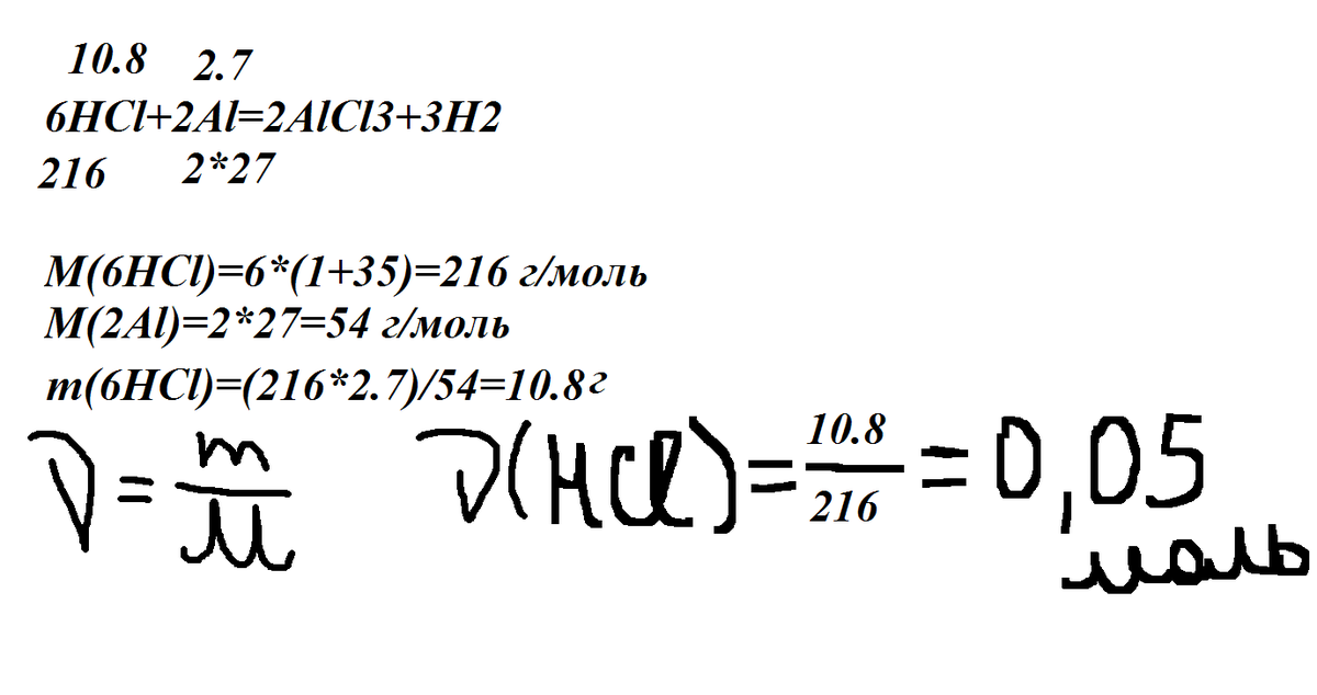 у реакцію з хлоридною кислотою вступив алюміній масою 2,7 г. обчисліть кількість речовини хлоридної кислоти, що вступила в реакцію
