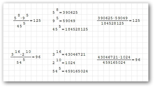 Найти значение выражения: (5 в 8 степени * 9 в 5 степени) / 45 в 5 степени. (3 в 16 степени * 2 в 10 степени) / 54 в 5 степени.