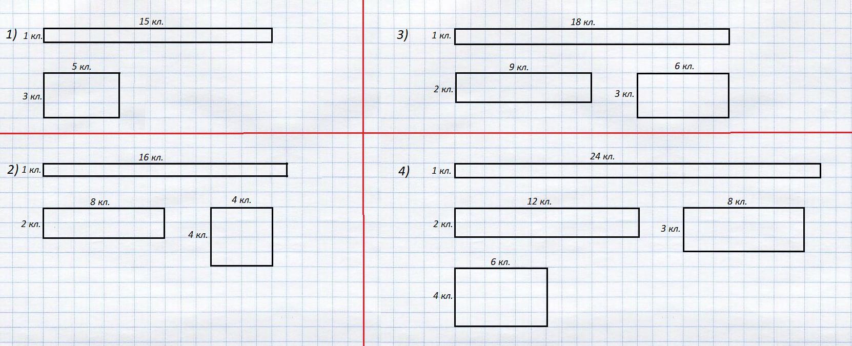 Нарисуй на клетчатой бумаге все прямоугольники площадью 15 клеток, 16 клеток, 18 клеток, 24 клетки.