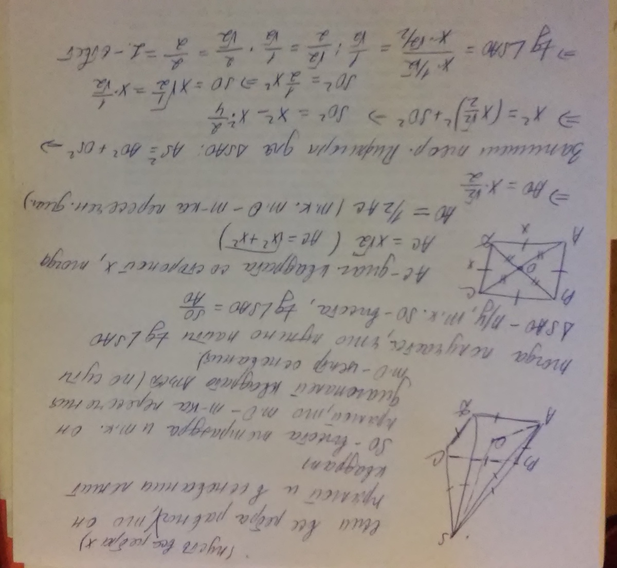 т.к. все ребра равны, то в основании квадрат и сам тетраэдр прямой, тангенс найдем из рассмотрения прямоуг треуг, составленного из высоты тетраэдра, половины диагонали основания и ребра (см. картинку)