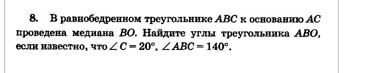 140 / 2 =70 , но ведь тогда ты делишь треугол. АВС на АВО так как ВО можно взять за биссектрису . Но надо найти углы А,В,О