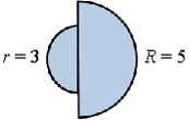 Будем исходить от формуля площади круга: s=pi*R^2, по рисунку видно что надо найти площади двух разных фигур (кругов) и при том по половине, то формула будет выглядеть так s1=(pi*R1^2)/2 и s2=(pi*R2^2)/2. Находим площади по-отдельности т.е. s1=(3.14*3^2)/2=14.13, s2=(3.14*5^2)/2=39.25 и теперь их сложим: 14,13+39,25=53,38 или если округлить до целых, то 53.