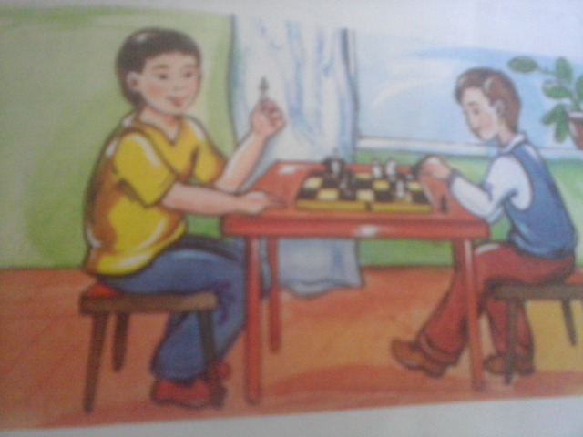 Дулат пен Айдар шахмат ойнап отыр.Олар жыл сайын шахмат турнирге қатысып тұрады.Дулат пен Айдар математика пəнінең жақсы оқиды себебі бұларға шахмат ойыны көмектеседі.