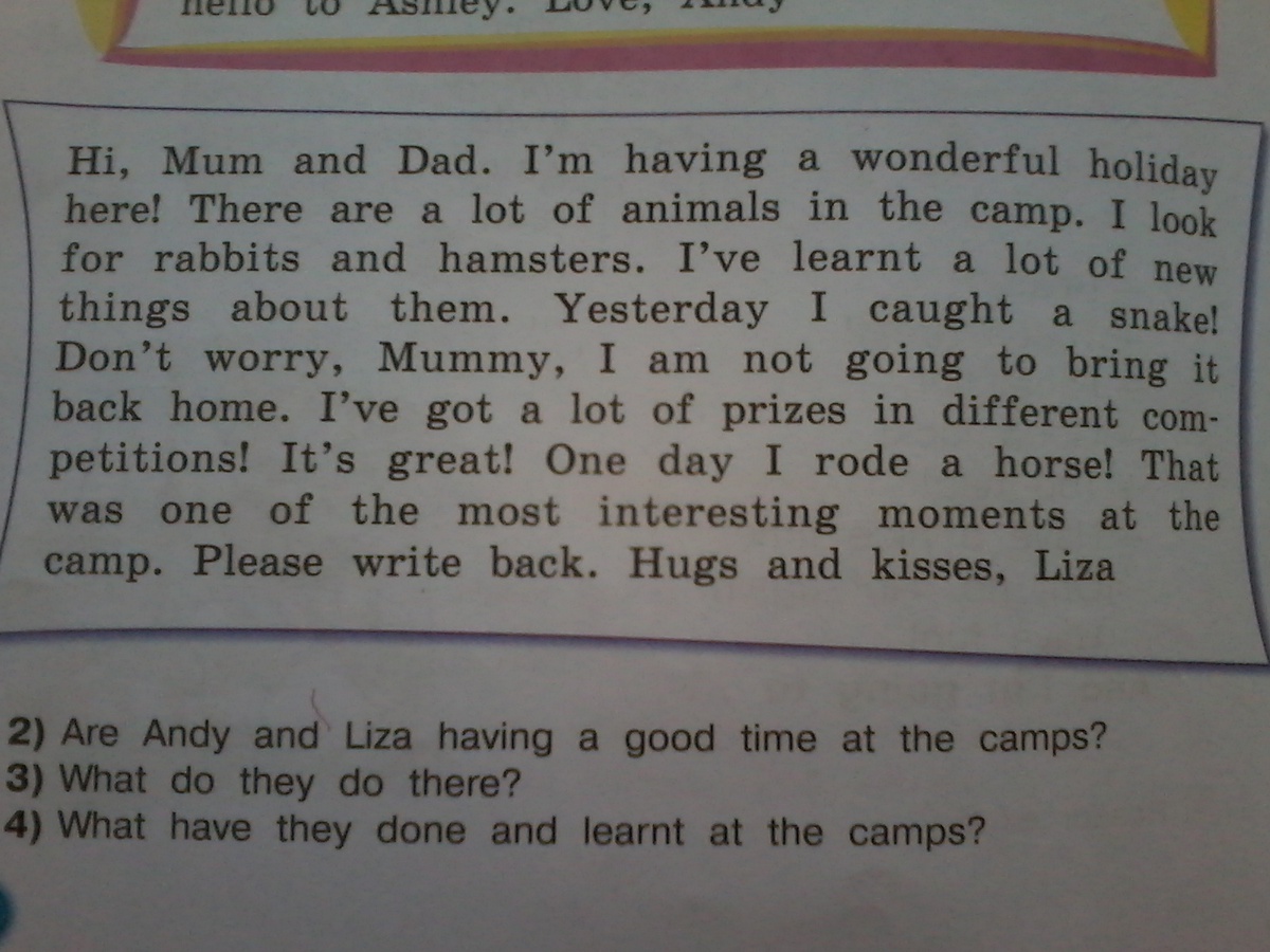 приват мам и пап, я хорошо провожу каникулы тут. в лагере много разных животных я наблюдаю за кроликами и хомяками. и узнаю новые сведения о них. вчера я поймала змею!!! не волнуйся мамочка, я не принесу ее домой. у меня есть много призов за разные соревнования! это великолепно! в один день я каталась на лошади! это был один из интереснейших моментов в отдыхе. пожалуйста напишите ответ. обнимаю и целую лиза