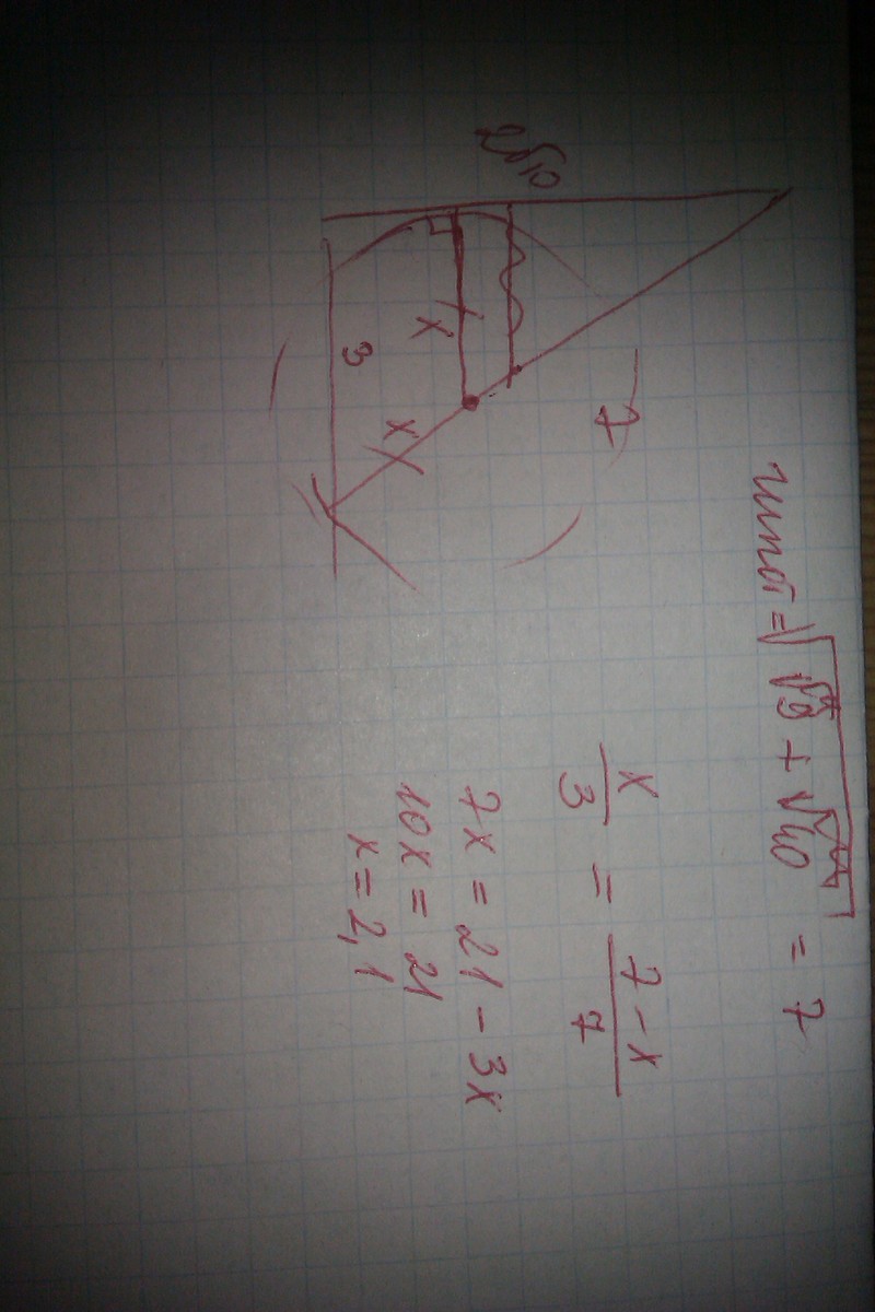 Оружность касается большого катета прямоугольного треугольника и проходит через вершину противолежащего острого угла. Найти радиус окружности,если ее центр лежит на гипотенузе, а длины катетов равны 3 и 2 корня из 10