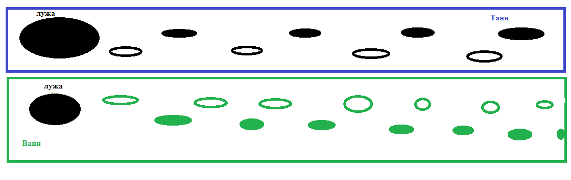 по рисунку: Таня левой ногой в лужу....