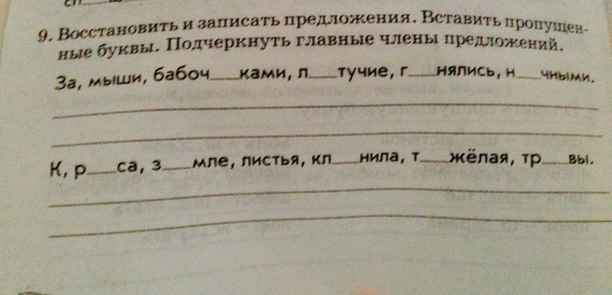 За ночными бабочками гонялись летучие мыши. (Летучие мыши - подлежащее, гонялись - сказуемое) Листья травы клонила к земле тяжелая роса. (роса - подлежащее, клонила сказуемое)