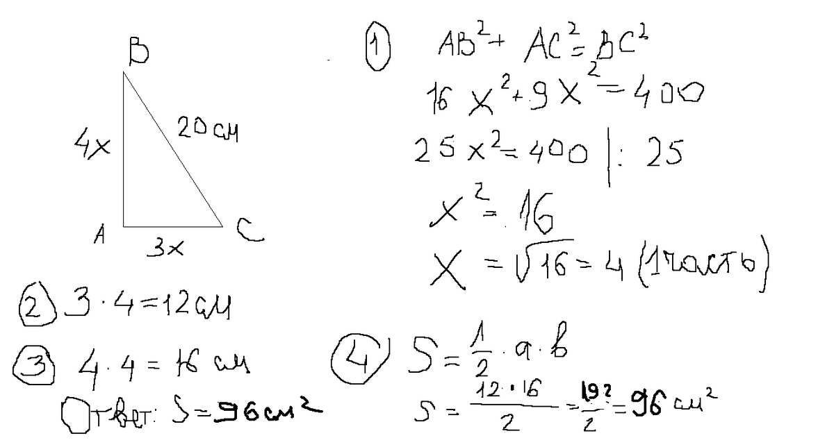 1) гипотенуза прямоугольного треугольника=20 см,а катеты отсносятся как 3:4. Найдите площадь этого треугольника.