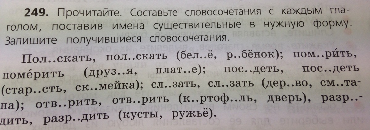 Полоскать белье, поласкать ребенка, помирить друзей, померить платье, поседеть от старости, посидеть на скамейке, слезать с дерева,слизать сметану, отварить картофель, отворить дверь, разредить кусты, разрядить ружье.
