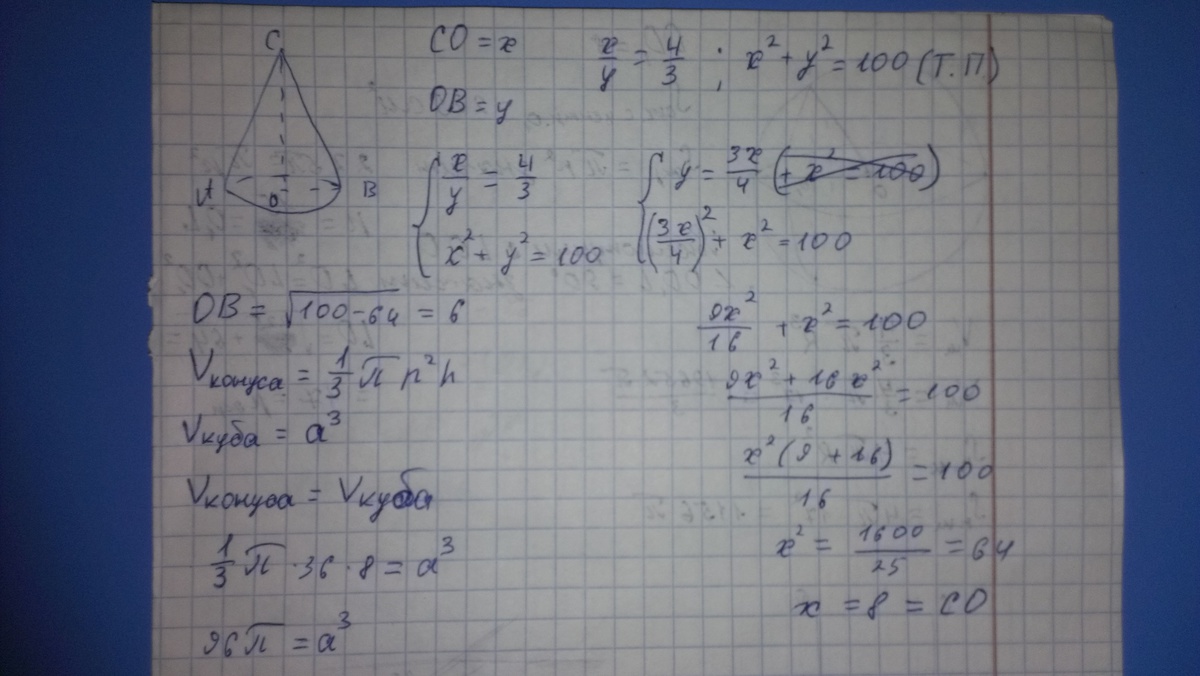 Радиус основания конуса относится к его высоте как 3:4, а его образующая равна 10 см. Найдите ребро куба, объём которого равен объёму данного конуса.