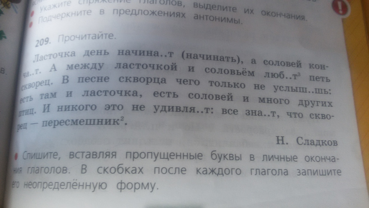 Ласточка день начинает, а солвей кончает (кончать). Между ласточкой и сольвьём любит (любить) петь (петь) скворец. В песне скворца чего только не услышишь (услышать): есть там и ласточка, есть соловей и много других птиц. И никого это не удивляет все знают (занть), что скворец пересмешник.