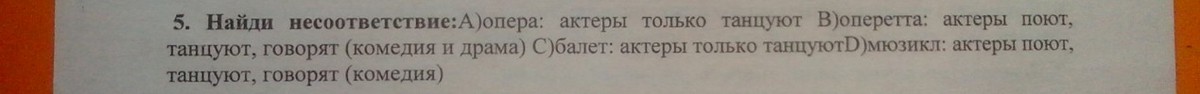 Ответ А опера: актёры только танцуют ( несоответствие)