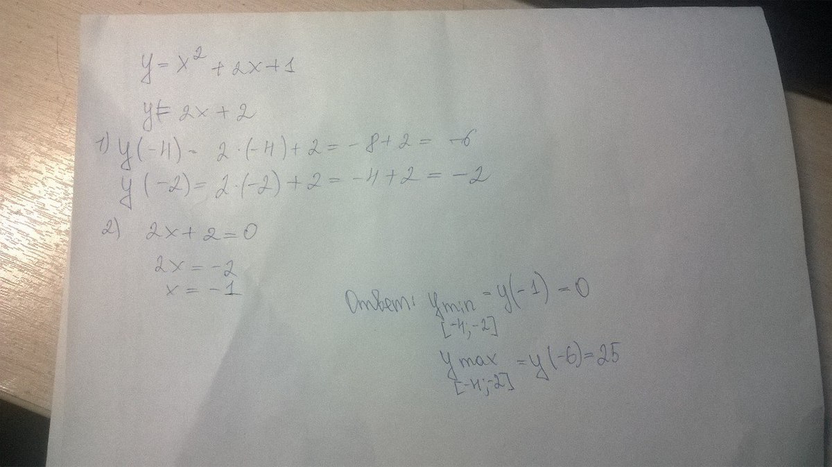 Помогите, ПЛИЗ! СРОЧНО! Найдите наибольшее и наименьшее значение функции y=x^2+2x+1 на промежутке [-4; -2]