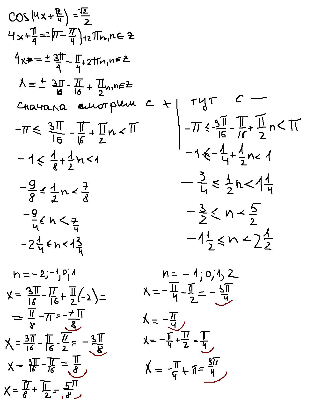 ПОМОГИТЕ ПОЖАЛУЙСТА, Найти корни уравнения cos(4x+pi/4)=-(корень из 2)/2, принадлежащие промежутку от -пи(включая), до пи (не включая).