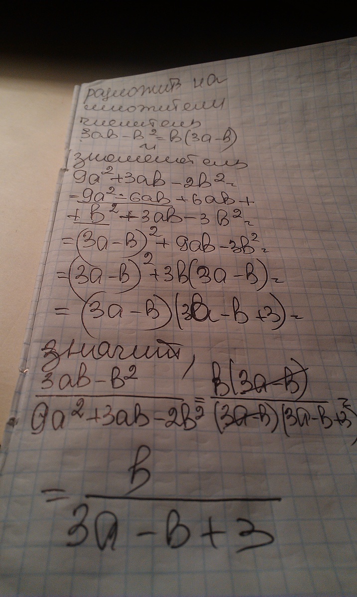 (3ab-b²)/(9a²+3ab-2b²)=b(3a-b)/(3a-b)(3a+2b)=b/(3a+2b)