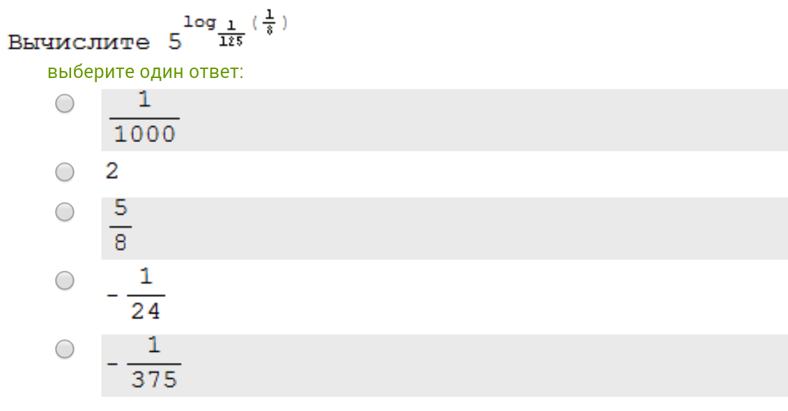 log₁/₁₂₅ (1/8)=log₅⁻³ (1/8)=(-1/3)*log₅(1/8)=log₅ (1/8)^(-1/3)=log₅2