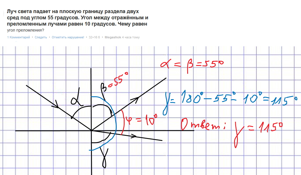 Луч света падает на плоскую границу раздела двух сред под углом 55 градусов. Угол между отражённым и преломленным лучами равен 10 градусов. Чему равен угол преломления?