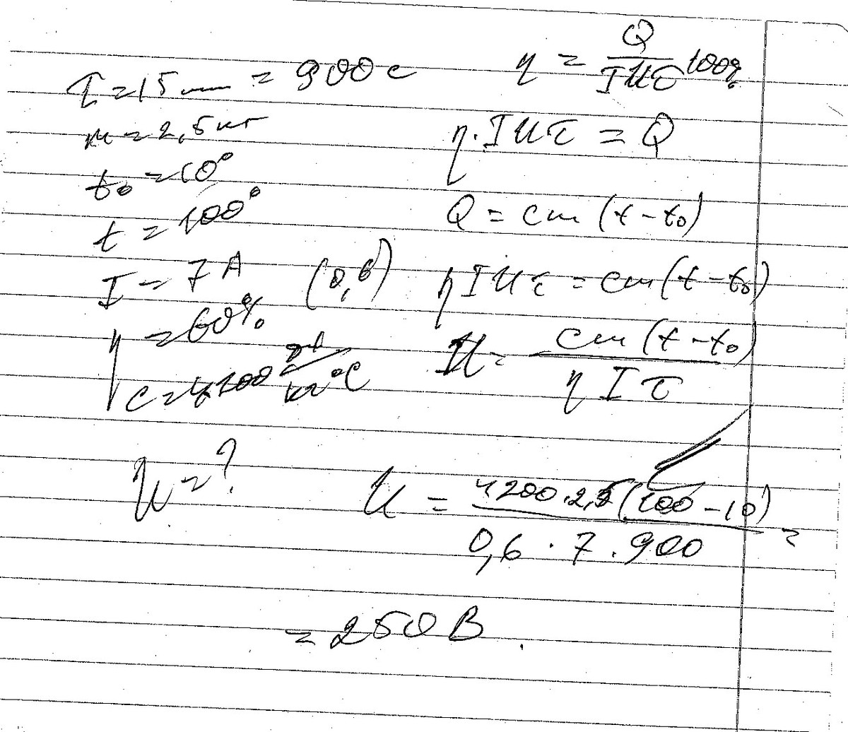 Электрический нагреватель за 15 мин доводит до кипения 2,5 кг воды, начальная температура которой 10•С. Сила тока в нагревателе 7 А, КПД нагревателя равен 60 процентов. Чему равно напряжение в электрической сети ? Удельная теплоемкость воды 4200 Дж/кг*•С