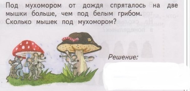 Под мухомором от дождя спрятались на две мышки больше,чем под белым грибом.Сколько мышек под белым грибом!