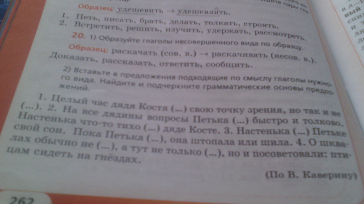 2. Целый час дядя Костя отстаивал свою точку зрения, но так и не отстоял. (дядя Костя -подл., отстаивал, не отстоял - сказуемое) На все дядины вопросы Петька отвечал быстро и толково (Петька - подл., отвечал - сказ.). Настенька что-то тихо сказала дяде Косте (Настенька - подл., сказала - сказ.). Настенька рассказала Петьке свой сон (Настенька - подл., рассказала - сказ). Пока Петька говорил, она штопала и шила (Петька - подл., штопала и шила - сказ.). О шквалах обычно не говорят, а тут не только говорят, но и посоветовали: птицам сидеть на гнездах (не говорят, не говорят, посоветовали - сказ).