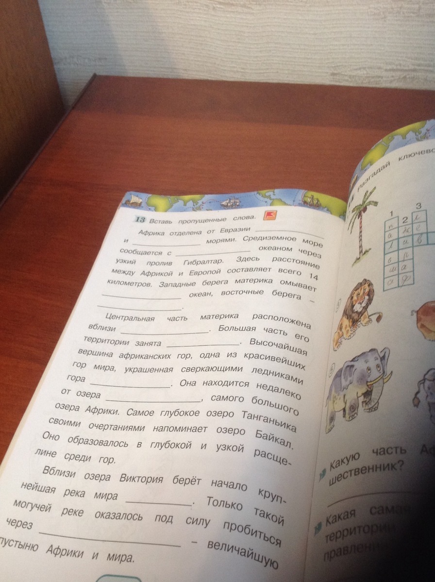 Африка отделена от Евразии Суэцким каналом,Красным и Средиземным морями. Средиземное море сообщается с Атлантическим океаном через узкий пролив Гибралтар.Здесь расстояние между Африкой и Европой составляет всего 14 километров. Берега Африки омывают два океана: с западной стороны - Атлантический, с восточной стороны - Индийский. Центральная часть материка расположена вблизи экватора. Большая часть его территории занята плоскогорьями и нагорьями. Высочайшая вершина Африки и одна из красивейших гор мира - украшенная сверкающими ледниками гора Килиманджаро. Она находится недалеко от озера Виктория - самого большого озера Африки. Самое глубокое озеро Африки Танганьика своими очертаниями напоминает озеро Байкал. Как и Байкал, оно образовалось в глубокой и узкой расщелине среди гор. Вблизи озера Виктория берет начало крупнейшая река мира Нил. Только такой могучей реке оказалось под силу пробиться через Сахару-величайшую пустыню Африки и мира.