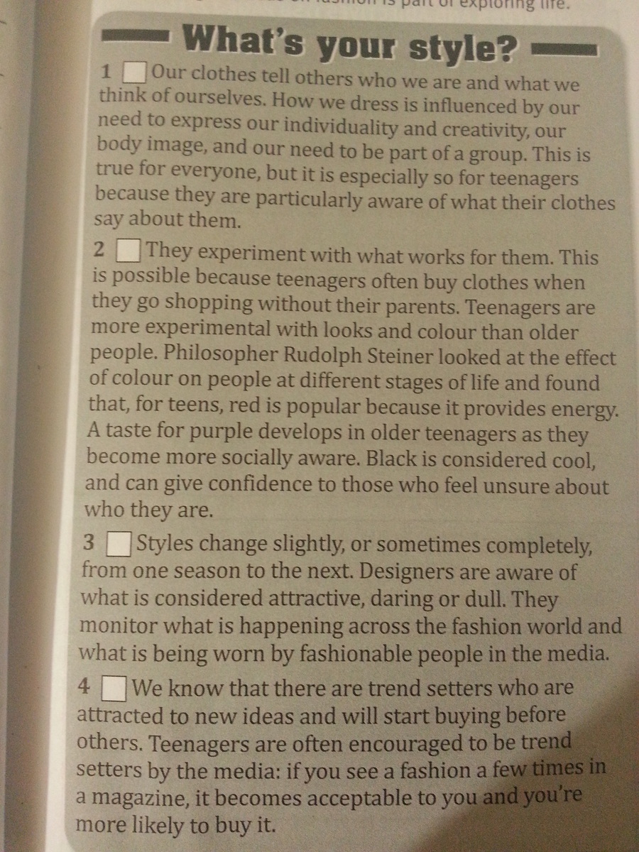 1. Наша одежда доносит до других, кто мы есть и что мы думаем о них. На то как мы одеваемся влияет наша потребность выражать свою индивидуальность и креативность, язык тела, потребность быть частью группы. Это распространяется на всех, но на подростков в частности, потому что они знают, что о них говорит их одежда.