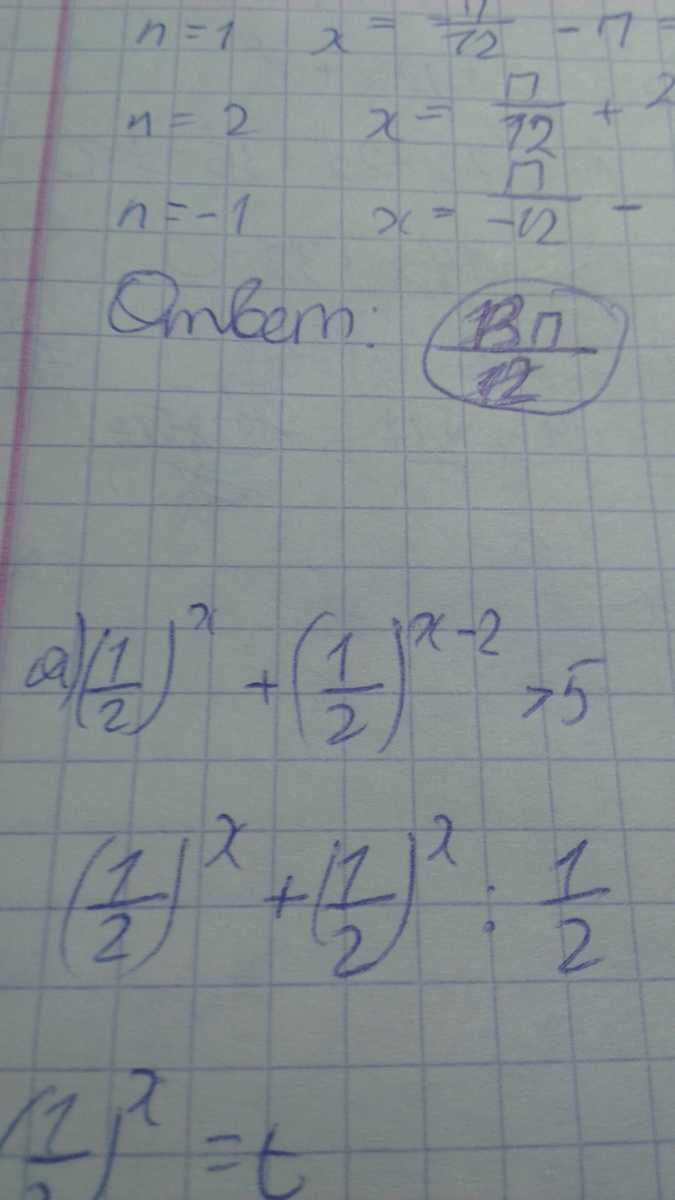 (\frac{1}{2})^x+(\frac{1}{2})^{x-2}\ \textgreater \ 5\\(\frac{1}{2})^x(1+(\frac{1}{2})^{-2})\ \textgreater \ 5\\(\frac{1}{2})^x*5\ \textgreater \ 5\\(\frac{1}{2})^x\ \textgreater \ 1\\(\frac{1}{2})^x\ \textgreater \ (\frac{1}{2})^0\ \ \ \ \ \ \ 0\ \textless \ \frac{1}{2}\ \textless \ 1\rightarrow men9em\ znak\\x\ \textless \ 0