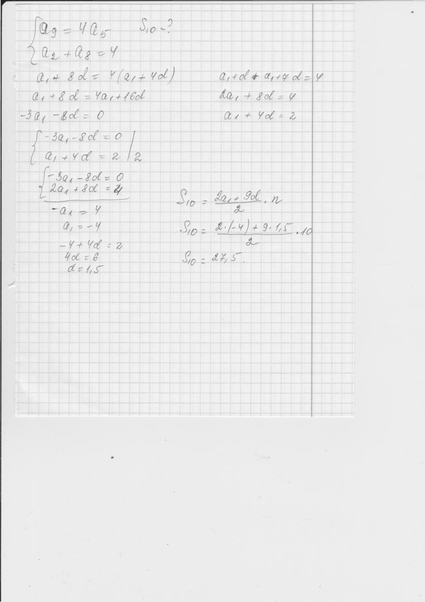 Известно, что 9-й член арифметической прогрессии в 4 раза больше ее 5-го члена. Сумма 2-го и 8-го членов прогрессии равна 4. Найдите сумму первых 10 членов данной прогрессии.