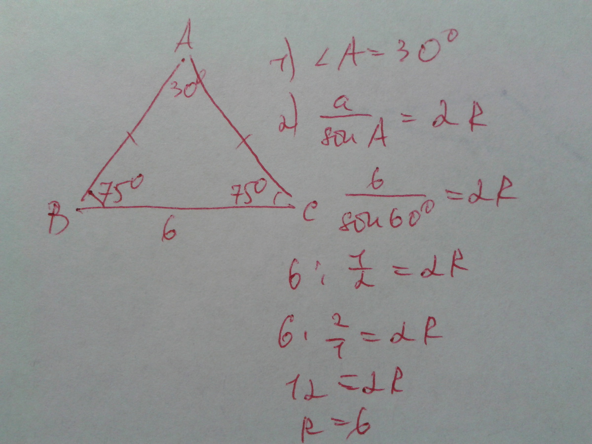 Угол при основании равнобедренного треугольника равен 75°, а основание - 6 см. Найдите длину радиуса описанной окружности.