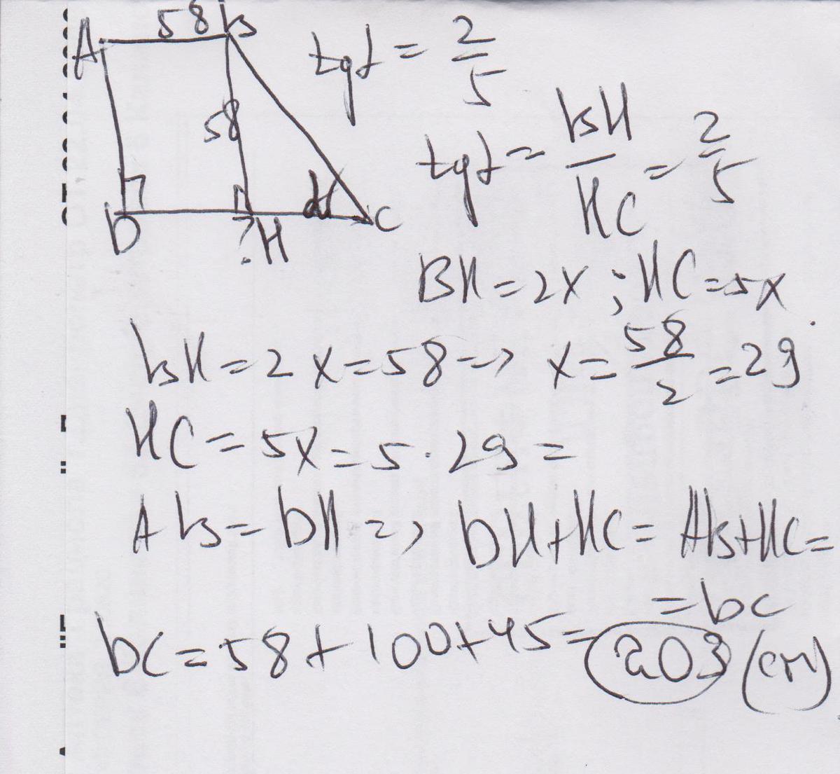 тангенс острого угла прямоугольной трапеции равен 2/5 найти ее большое основание если меньшие основание равно высоте и равно 58