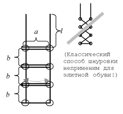 Рис. 1 Шнуровка должна происходить элитным способом «наверх, по горизонтали в другой ряд, наверх, по горизонтали и т.д.» (см. рисунок). Кроме того, чтобы шнурки можно было завязать элитным бантиком, длина свободного конца шнурка должна быть l.