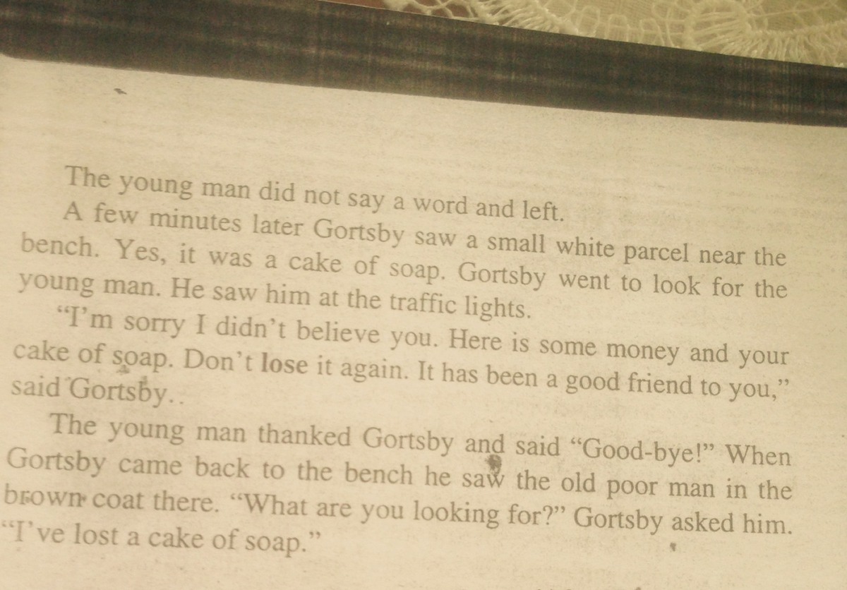 "Прости, что не поверил тебе. Здесь определенная сумма и ваш торт из мыла. Не потеряй его снова. Он был тебе хорошим другом," - сказал Gortsby.