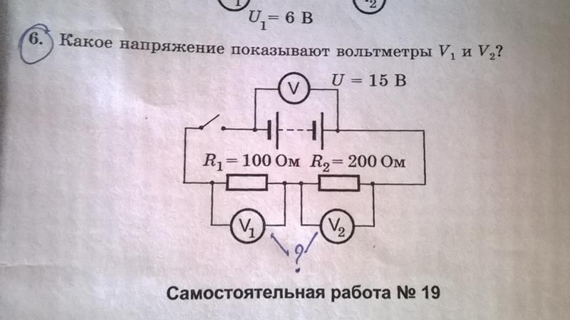 Какие напряжения показывают вольтметры v1 и v2, подключенные к проводникам сопротивлениями R1 и R2?